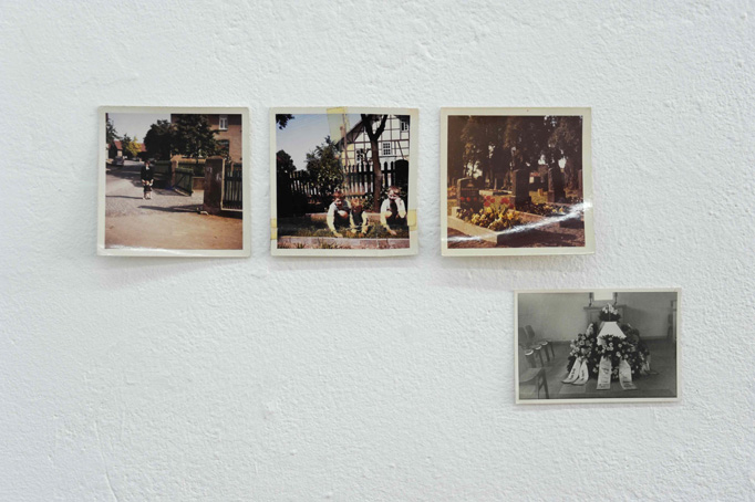 Materialinstallation aus gefundenen und eigenen Fotografien, Texten, Objekten (Detail)