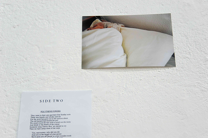 Materialinstallation aus gefundenen und eigenen Fotografien, Texten, Objekten (Detail)